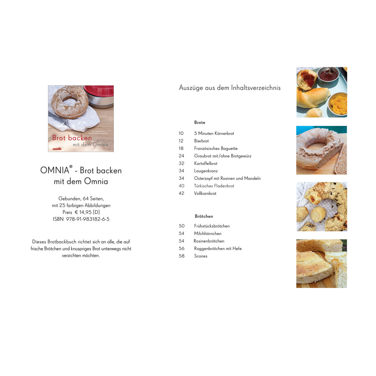 Das Backbuch richtet sich an alle, die auf frische Brötchen und knuspriges Brot im Urlaub nicht verzichten möchten. Camper,- Wohnwagen- und Bootsbesitzer, sowie alle anderen, die unterwegs mit dem RoadBaker oder OMNIA Campingbackofen sind, können jetzt ganz einfach frisches Brot und Brötchen genießen. Ob knuspriges Baguette, saftiges Kartoffelbrot oder uriges Landbrot. In diesem Buch findest du tolle alltagstaugliche Brot- und Brötchenrezepte, sowie umfangreiche Tipps und Hintergründe zum Brot backen im RoadBaker und OMNIA.